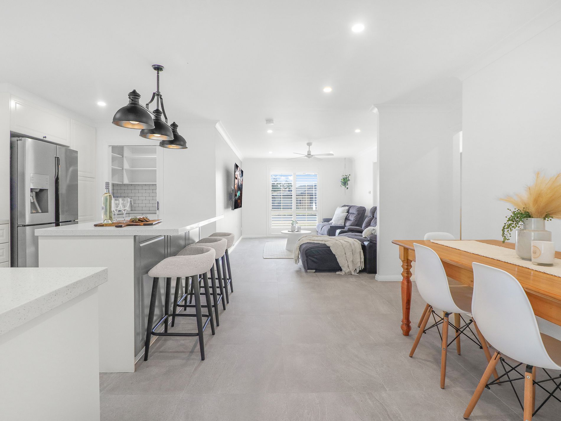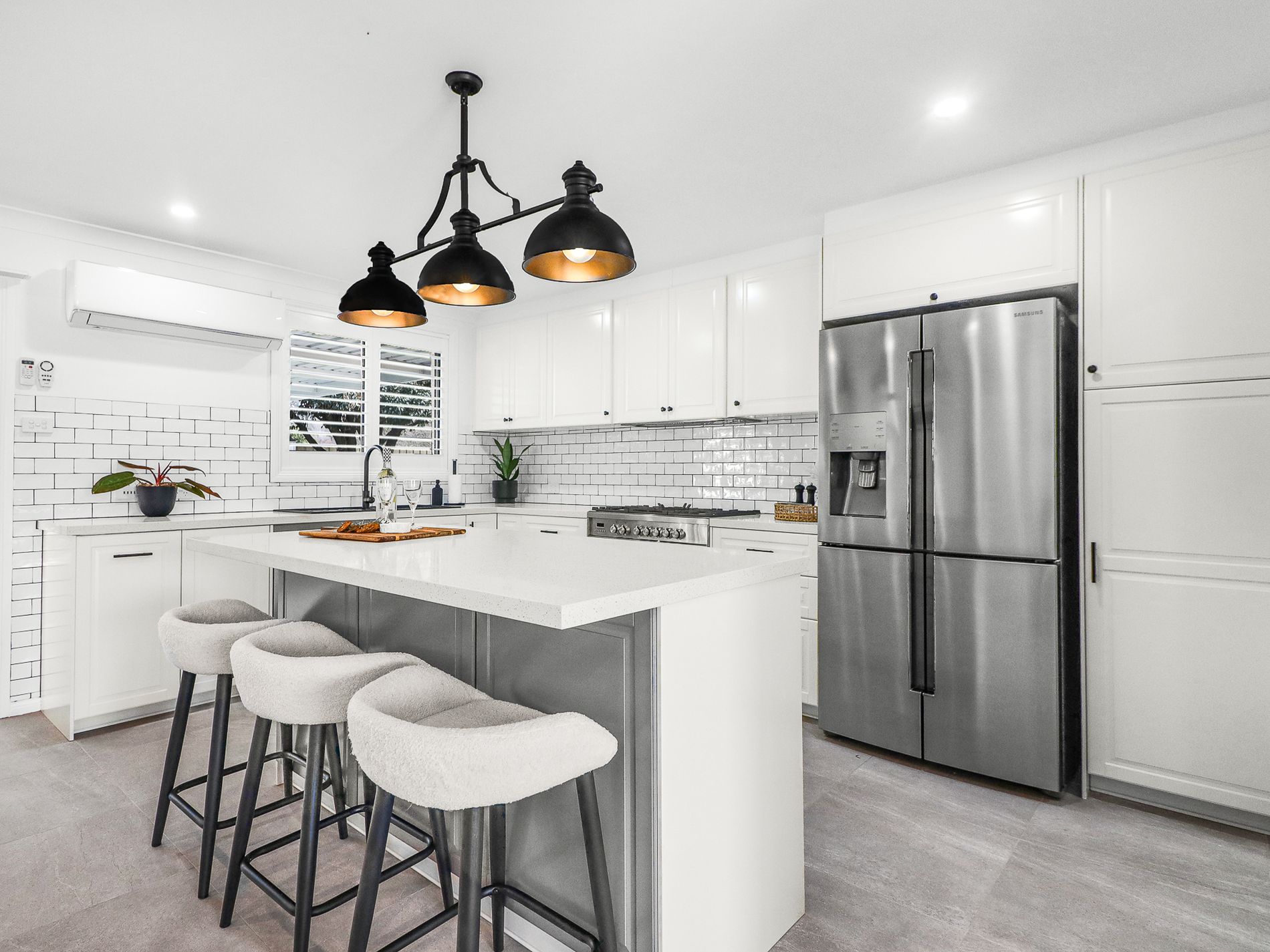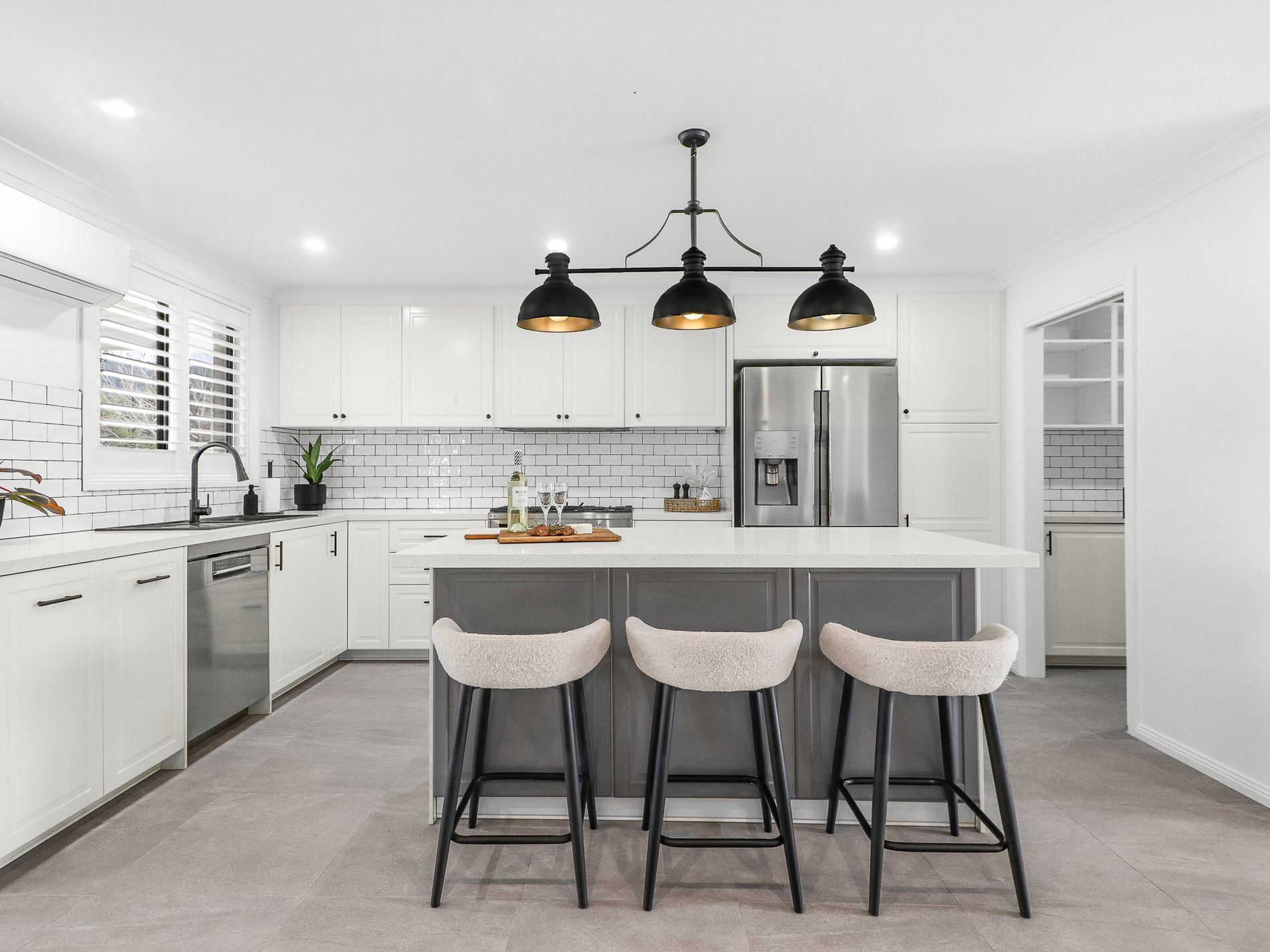The large central island, accentuated by stylish pendant lighting, offers a welcoming space for casual dining or entertaining guests.