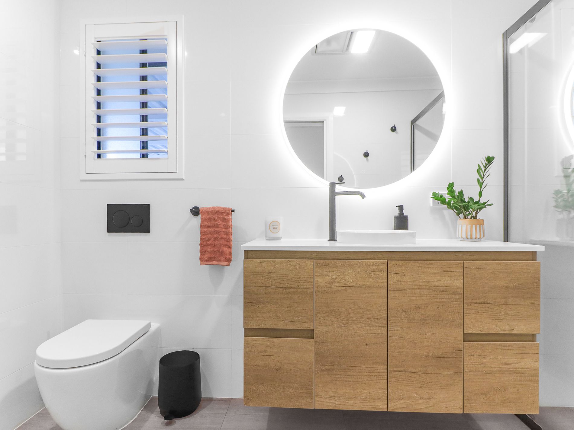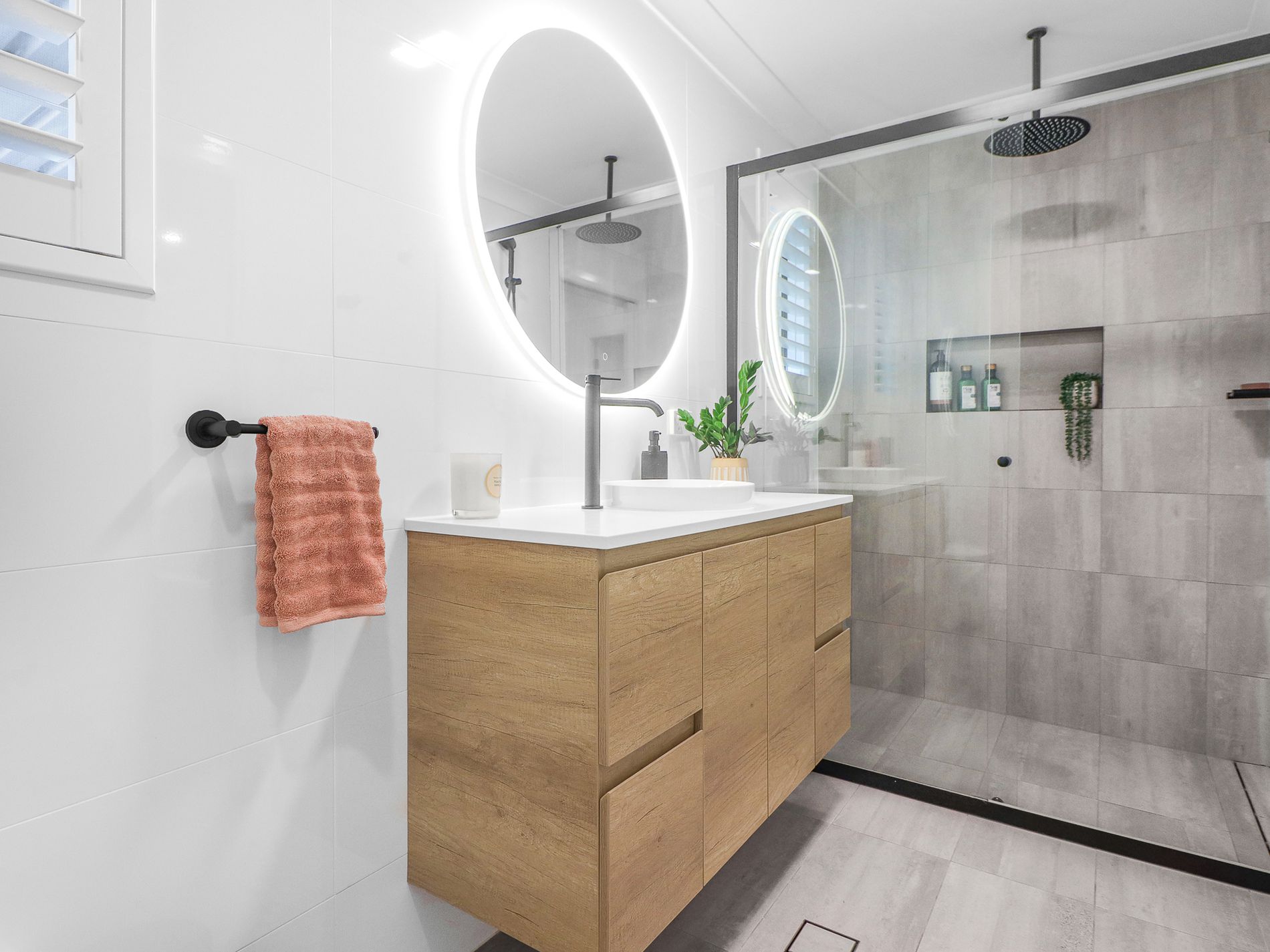 Luxurious Bathroom: Indulge in the opulence of high-end finishes and meticulous attention to detail a sanctuary of style and comfort. Featuring floor-to-ceiling tiles, a spacious walk-in shower with a waterfall head, and sleek matte black tapware, this bathroom is a true indulgence. The contemporary wall-hung vanity completes the sophisticated look.