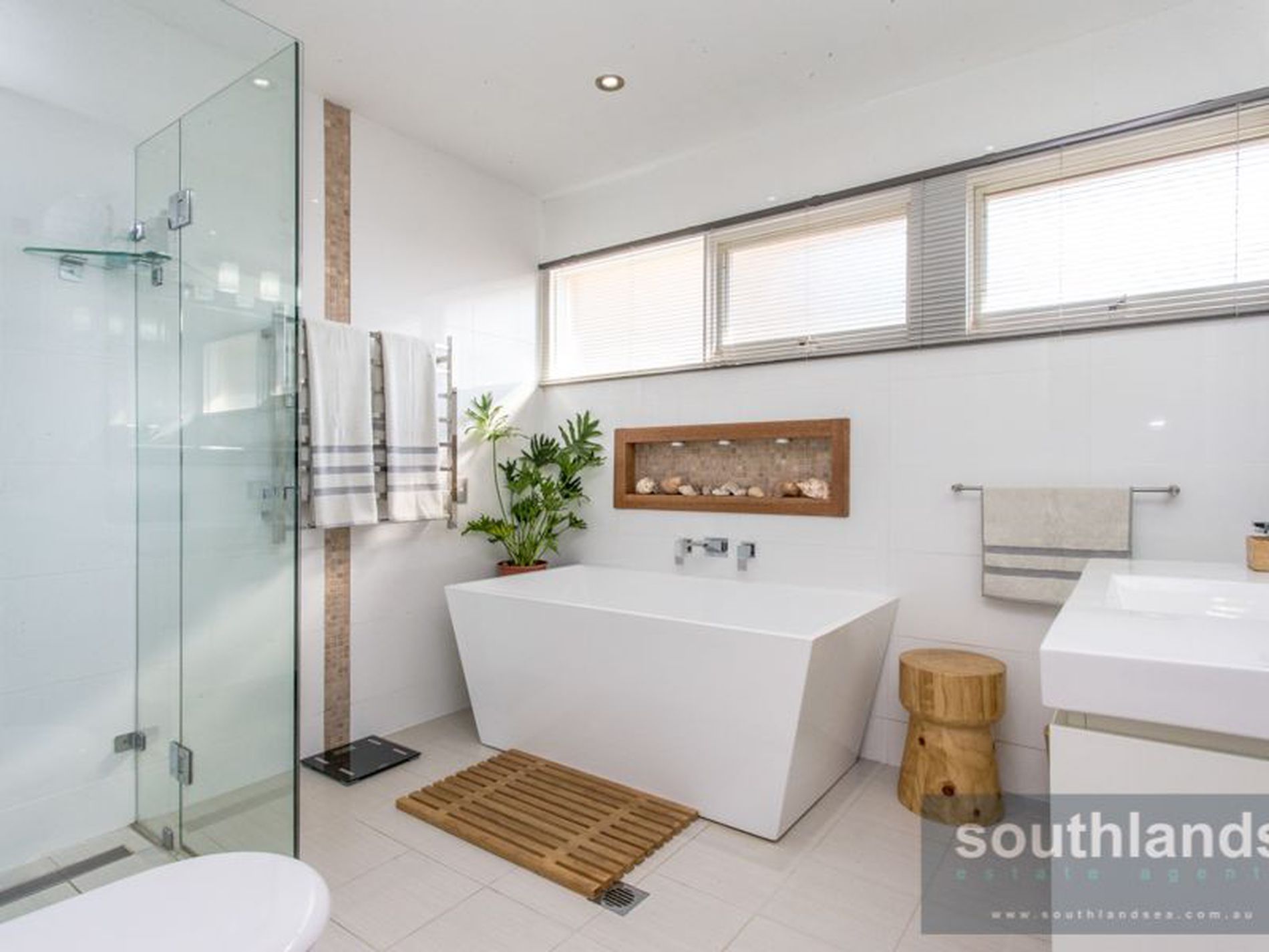 • Modern bathroom with floor to ceiling tiles and all quality fittings.